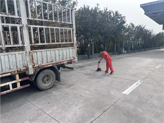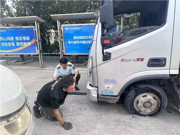 值班站长陈亚朋引导车辆停靠至安全区域,布设隔离锥,同时安排专人在来车方向进行预警提示。经现场查看,确认车辆因轮胎爆胎导致异常,而驾驶人表示未携带备胎,且不熟悉周边维修网点,一时面露焦急。了解情况后,保定西收费站立即联系了与站口超市合作的车辆维修服务点,说明车辆故障情况及具体位置,考虑到车内随行的老人立即安排老人到站口超市休息。约 8 分钟后,维修人员携带工具和适配轮胎赶到现场,机电员王乐在旁协助递工具、清理现场杂物,维修人员快速完成轮胎更换作业。待车辆检查确认无安全隐患后,引导货车安全驶出应急区域叮嘱其注意行车安全后,随即返回工作岗位继续开展宣传活动。