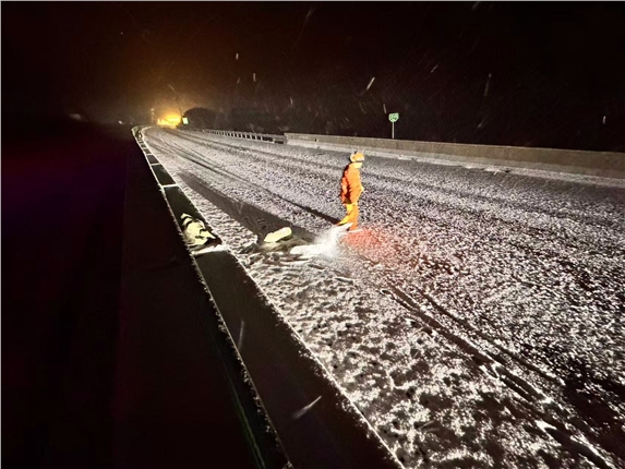 11日午时,降雪开始,昼夜不间断巡视也随之开始,巡视人员随时通过电话、微信工作群分享各路段雪情和路况,便于精准施策,酌情进行融雪剂撒布,重点对桥梁、急弯等易结冰、事故多发地加大撒布量。降雪持续不断,职工们昼夜奋战,截至12日8:00,已投入除雪车辆6台班,撒布融雪剂57吨,全路段保持正常通行。